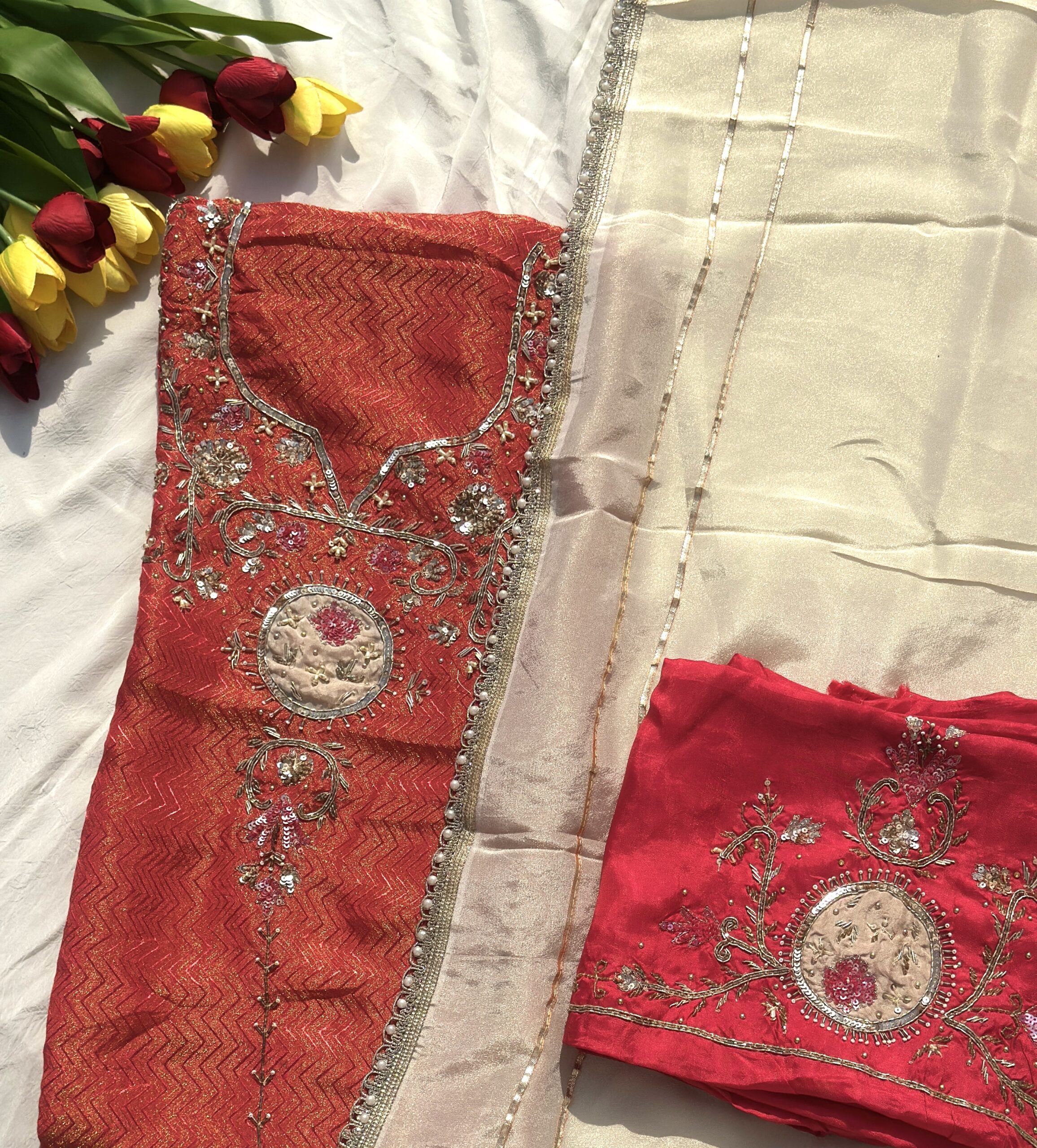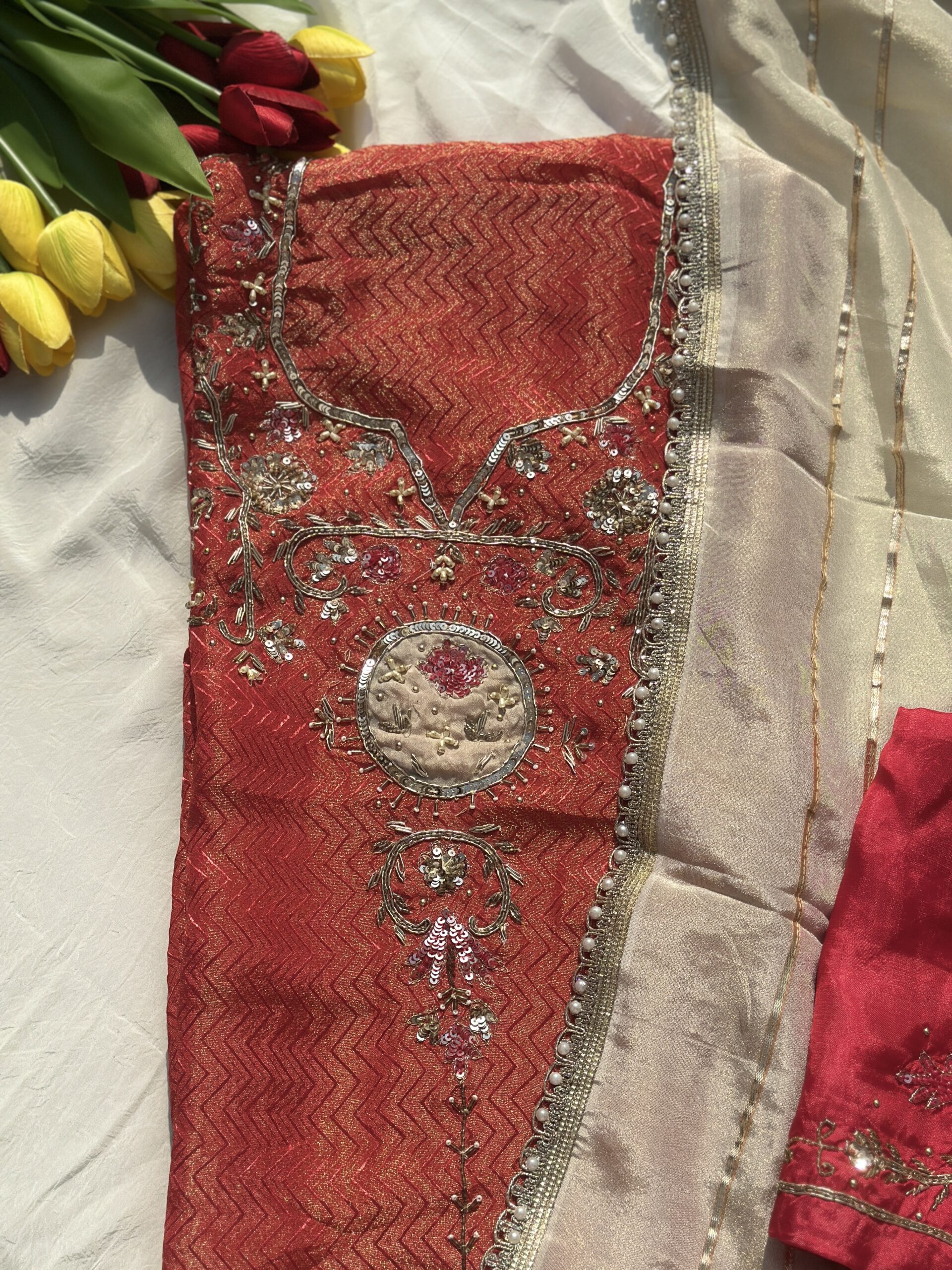 Elevate your festive wardrobe with this luxurious royal red kurta set, crafted from rich jacquard silk-blend fabric featuring an elegant chevron weave pattern. The kurta is beautifully adorned with intricate zari, sequin, and thread embroidery forming delicate floral and ornamental motifs across the neckline and front panel. A statement circular embroidered medallion adds a regal touch to the design. It is paired with a graceful off-white organza dupatta, highlighted with fine gold stripes and pearl-lace borders, creating a perfect balance of richness and sophistication. Ideal for weddings, festive celebrations, and special occasions, this ensemble exudes timeless ethnic charm.
