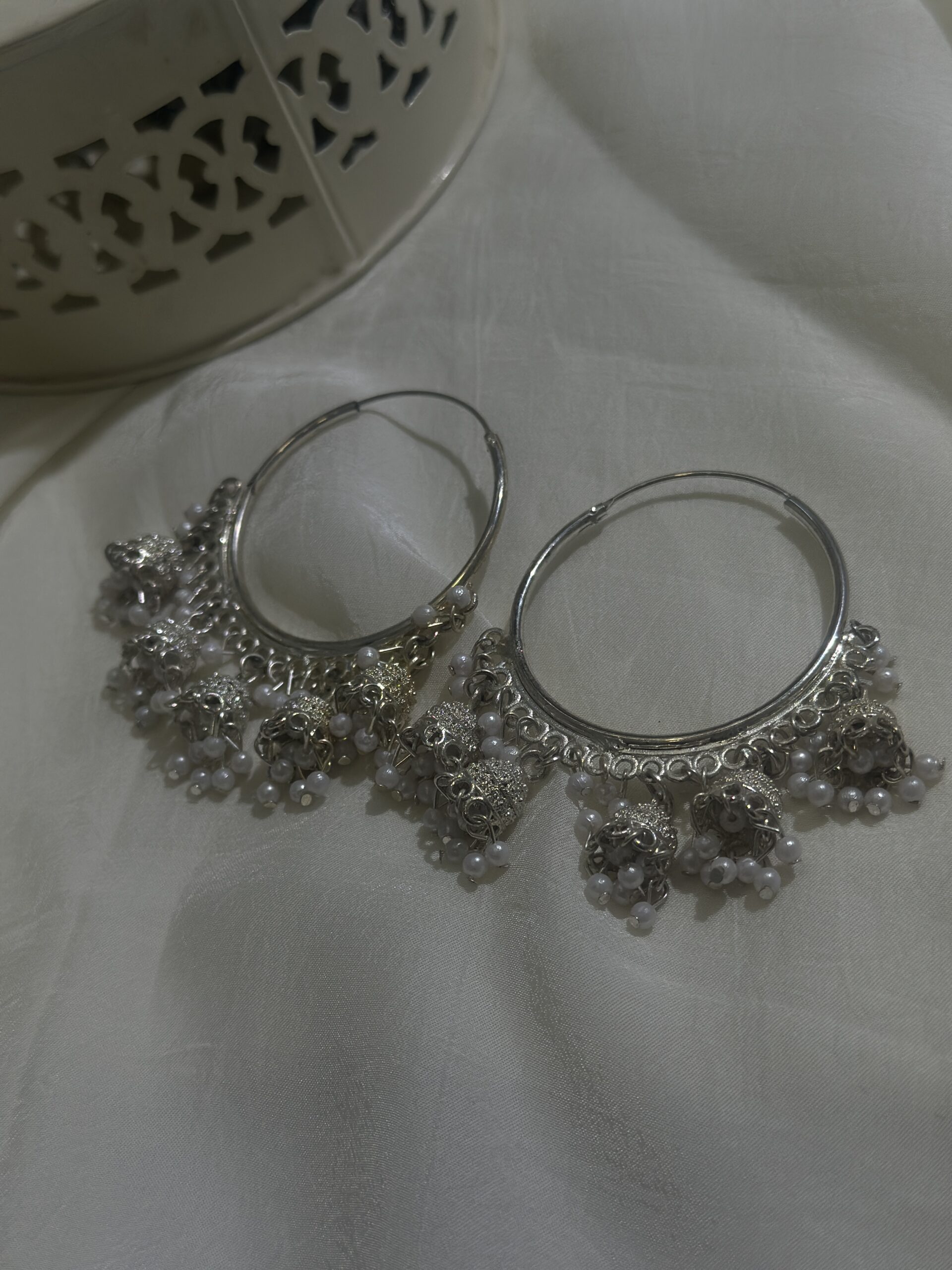 Add a touch of timeless elegance to your look with these beautifully crafted silver-toned hoop earrings. Designed in a traditional jhumka-inspired style, these statement hoops feature delicate pearl clusters and intricate detailing that create graceful movement and charm with every step.